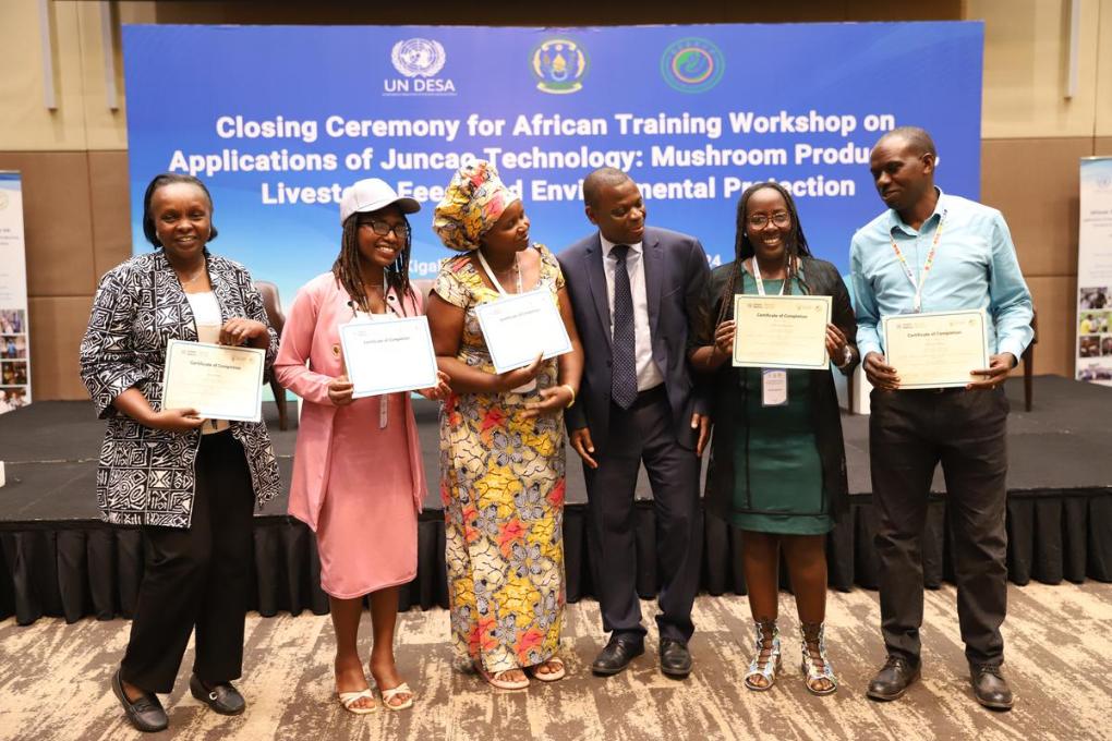 8月初,在非洲地區(qū)菌草技術(shù)培訓(xùn)班舉辦期間,聯(lián)合國(guó)官員和使團(tuán)代表團(tuán)專程赴盧旺達(dá)考察菌草技術(shù)和產(chǎn)業(yè)在非洲地區(qū)的發(fā)展?!拔液芨吲d同其他聯(lián)合國(guó)官員一起,親眼見證菌草技術(shù)以實(shí)際行動(dòng)造福民眾。”聯(lián)合國(guó)秘書長(zhǎng)辦公室主任考特尼·拉特雷說(shuō),菌草技術(shù)具有“可負(fù)擔(dān)”的突出優(yōu)勢(shì),“對(duì)非洲大陸所有發(fā)展中國(guó)家很有價(jià)值、非常適用”。