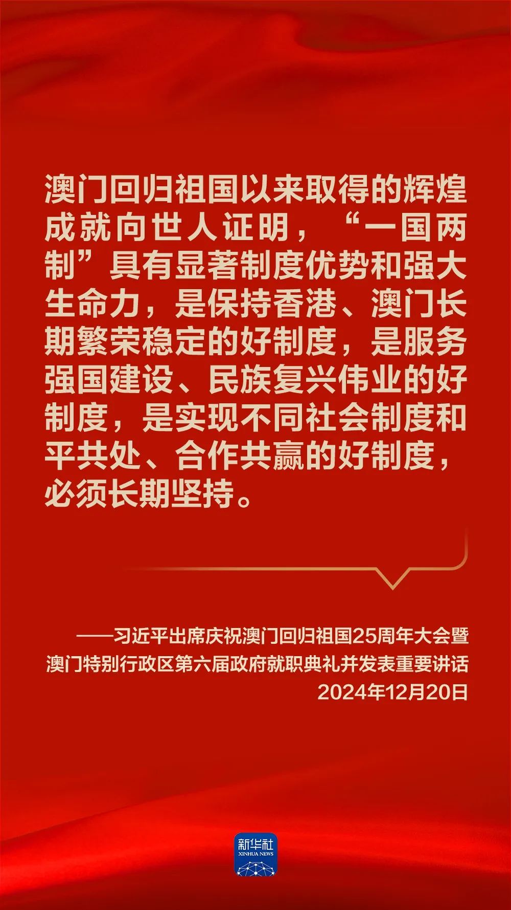 慶祝澳門回歸祖國(guó)25周年大會(huì)暨澳門特別行政區(qū)第六屆政府就職典禮20日上午在澳門東亞運(yùn)動(dòng)會(huì)體育館隆重舉行。中共中央總書記、國(guó)家主席、中央軍委主席習(xí)近平出席并發(fā)表重要講話。一起來(lái)看講話金句——