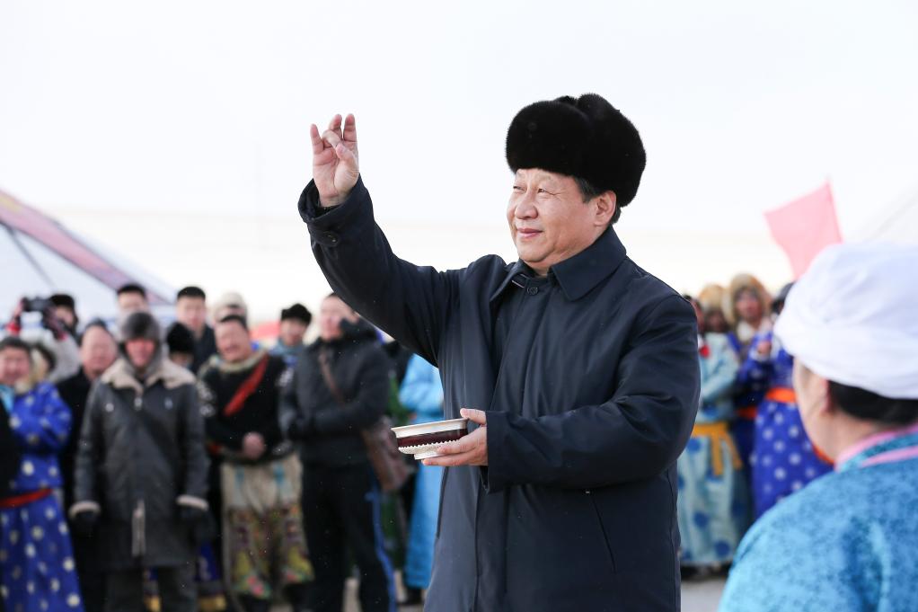 2014年1月,習(xí)近平總書(shū)記在內(nèi)蒙古調(diào)研看望慰問(wèn)各族干部群眾。按照蒙古族習(xí)俗,總書(shū)記用無(wú)名指蘸上用銀碗盛著的鮮牛奶彈了三下,借“五畜祈福”寓意,祝福來(lái)年風(fēng)調(diào)雨順,五畜興旺,人民幸福安康。