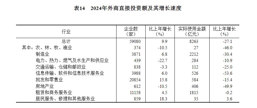 全年新設(shè)外商投資企業(yè)59080家,比上年增長9.9%。實(shí)際使用外資8263億元,下降27.1%,折1162億美元,下降28.8%。其中,共建“一帶一路”國家(含通過部分自由港對華投資)對華新設(shè)外商投資企業(yè)17172家,增長23.8%;對華直接投資1147億元,下降6.2%,折161億美元,下降8.4%。高技術(shù)產(chǎn)業(yè)實(shí)際使用外資2864億元,下降32.3%,折403億美元,下降34.0%。