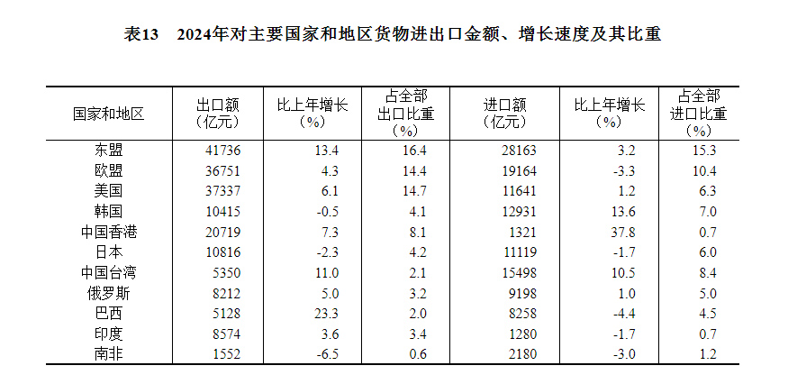 全年貨物進(jìn)出口總額438468億元,比上年增長5.0%。其中,出口254545億元,增長7.1%;進(jìn)口183923億元,增長2.3%。貨物進(jìn)出口順差70623億元。對共建“一帶一路”[50]國家進(jìn)出口額220685億元,比上年增長6.4%。其中,出口122095億元,增長9.6%;進(jìn)口98589億元,增長2.7%。對《區(qū)域全面經(jīng)濟(jì)伙伴關(guān)系協(xié)定》(RCEP)其他成員國[51]進(jìn)出口額131645億元,比上年增長4.5%。民營企業(yè)進(jìn)出口額243329億元,比上年增長8.8%,占進(jìn)出口總額比重為55.5%;其中出口164717億元,增長9.4%。