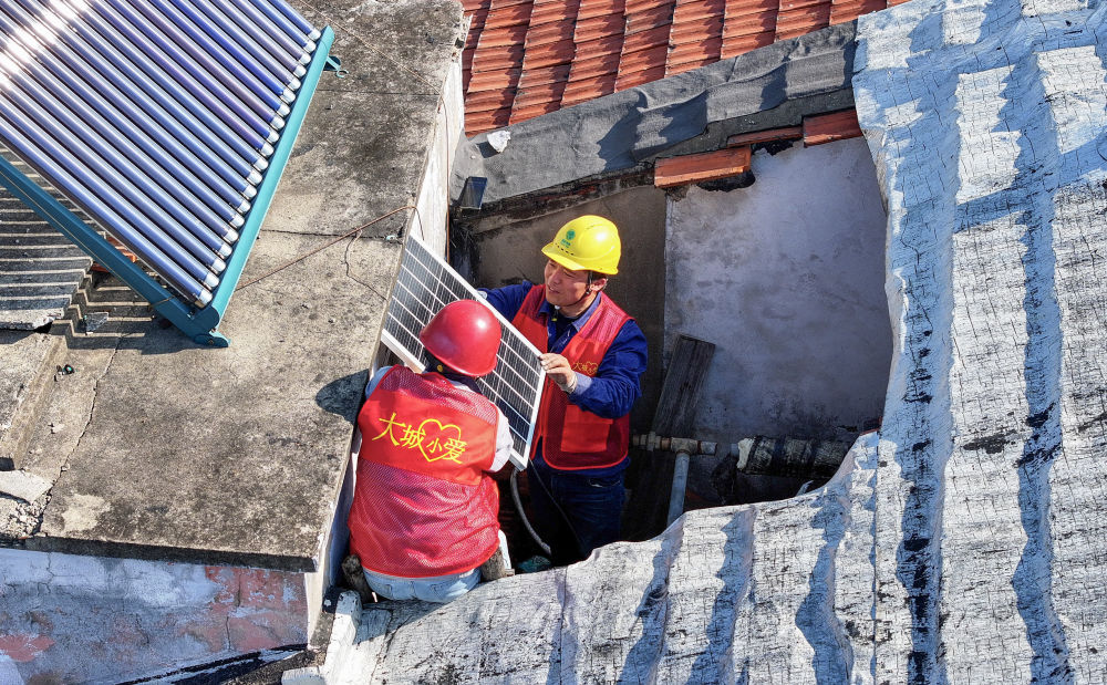 2025年3月2日,浙江余姚大城小愛(ài)公益服務(wù)中心志愿者在一老舊小區(qū)開展太陽(yáng)能照明公益改造,照亮老社區(qū)居民的回家路(無(wú)人機(jī)照片)。