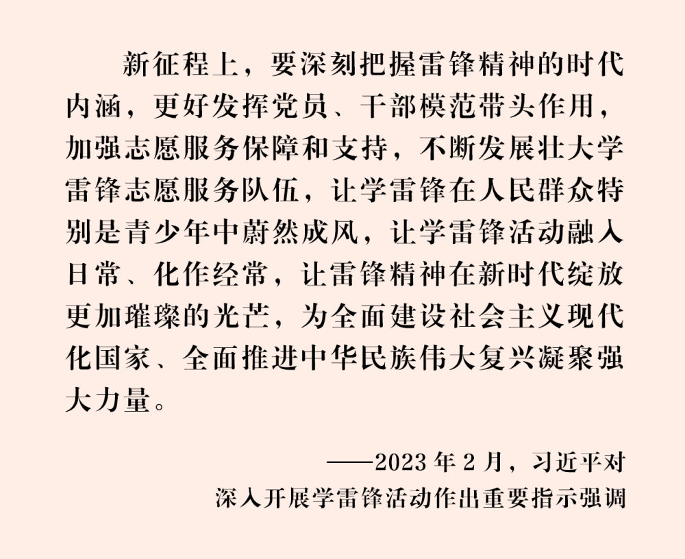 “實(shí)踐證明,無(wú)論時(shí)代如何變遷,雷鋒精神永不過(guò)時(shí)。”黨的十八大以來(lái),習(xí)近平總書記在多個(gè)場(chǎng)合發(fā)表講話、作出指示,深刻闡明雷鋒精神的永恒價(jià)值,明確要求發(fā)展壯大學(xué)雷鋒志愿服務(wù)隊(duì)伍,為新時(shí)代更好弘揚(yáng)雷鋒精神提供了根本遵循。