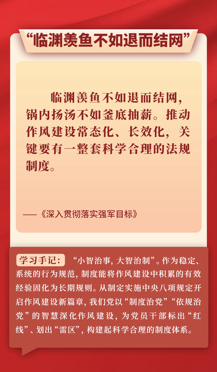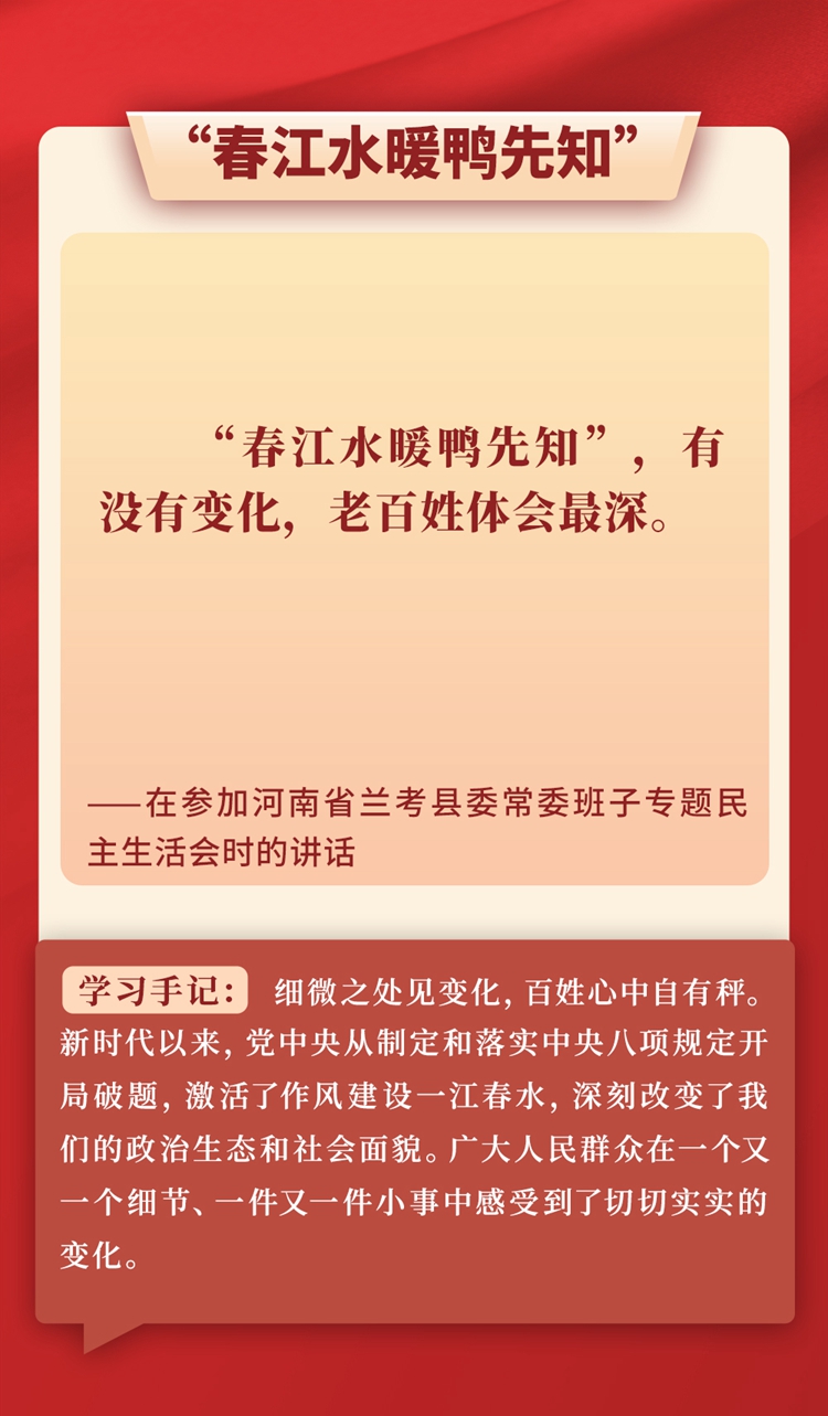 “問渠那得清如許?為有源頭活水來?!标P于作風建設,習近平總書記常引用各種古語典故,有的從警示層面講危害,有的從倡導層面談踐行,旁征博引、畫龍點睛,把古人智慧化用于作風建設的當代實踐,給人以思想啟迪、靈魂洗禮。