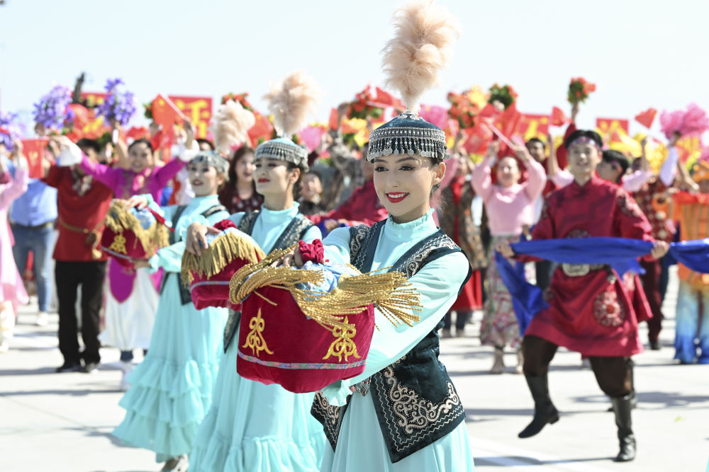 各族群眾代表身著民族服飾,載歌載舞,歡迎習(xí)近平總書記的到來,表達(dá)對(duì)總書記的衷心祝福。