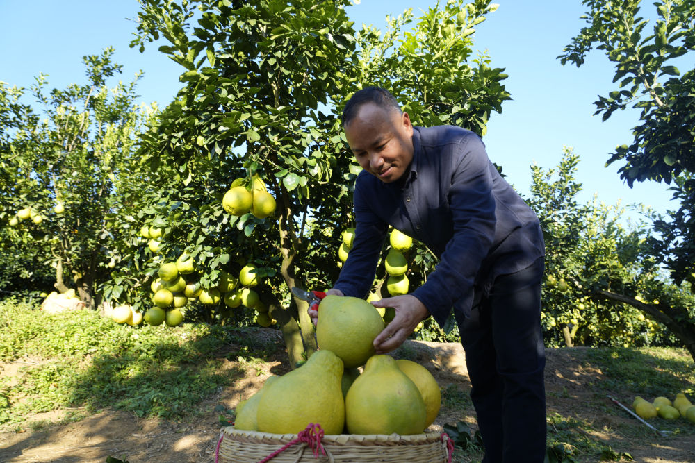 2025年11月7日,柚農(nóng)在梅州南福金柚種植基地采摘柚子。