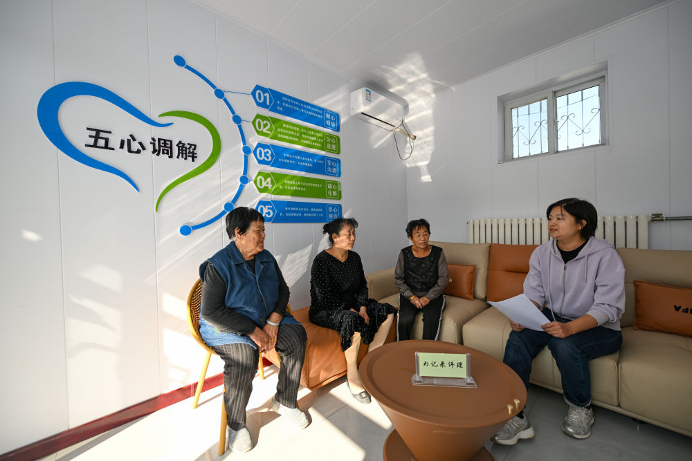 在天津市寧河區(qū)蘆臺街道金華路社區(qū),社區(qū)黨總支副書記吳蕊(右一)就社區(qū)監(jiān)控設(shè)備安裝問題為社區(qū)居民進行解答(2024年10月11日攝)。金華路社區(qū)積極踐行新時代“楓橋經(jīng)驗”,將原社區(qū)居委會閑置用地提升改造成為聯(lián)絡(luò)群眾的基層綜合治理陣地——“解鈴小院”。新華社記者 孫凡越 攝