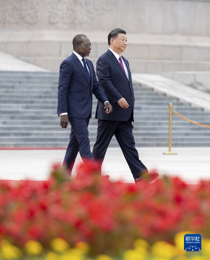 會(huì)談前,習(xí)近平在人民大會(huì)堂東門外廣場為塔隆舉行歡迎儀式。
