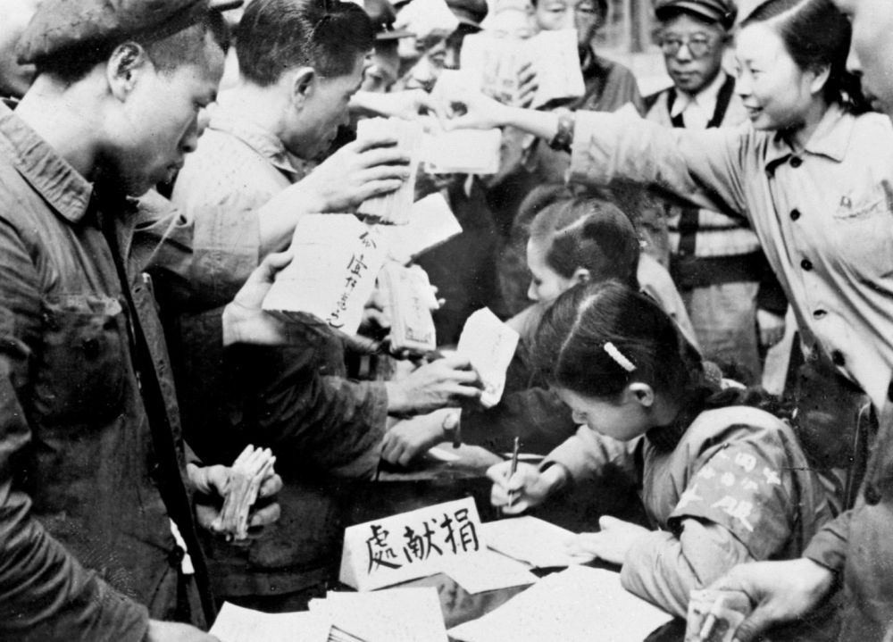 全國(guó)各地工商界踴躍捐獻(xiàn)款項(xiàng),支援志愿軍。這是重慶市工商業(yè)者捐獻(xiàn)的情形。新華社發(fā)(資料照片)