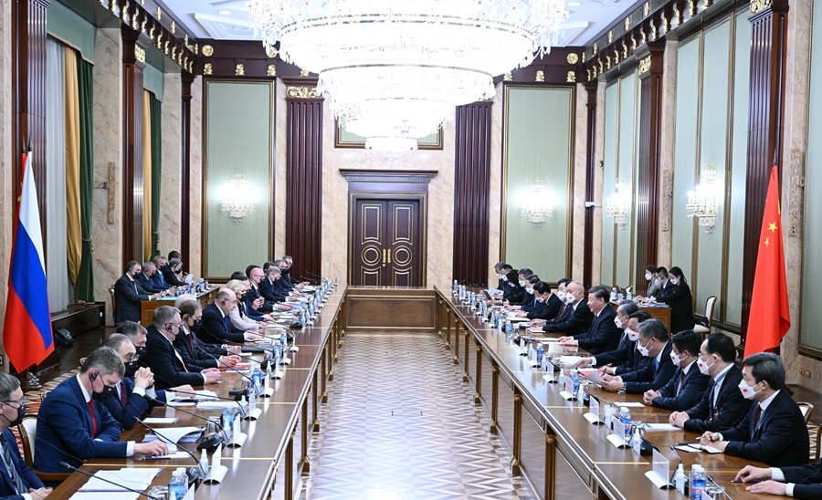 當(dāng)?shù)貢r(shí)間3月21日上午,國(guó)家主席習(xí)近平在俄羅斯聯(lián)邦政府大廈會(huì)見俄羅斯總理米舒斯京。新華社記者 丁海濤 攝