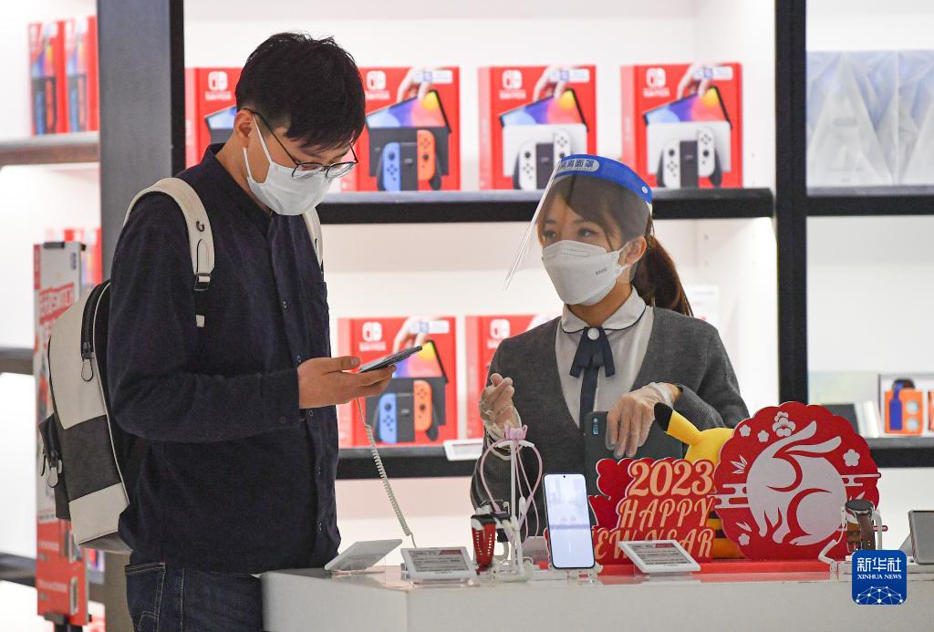 1月19日,消費(fèi)者在中免集團(tuán)??谌赵聫V場(chǎng)免稅店選購(gòu)電子產(chǎn)品。新華社記者 蒲曉旭 攝