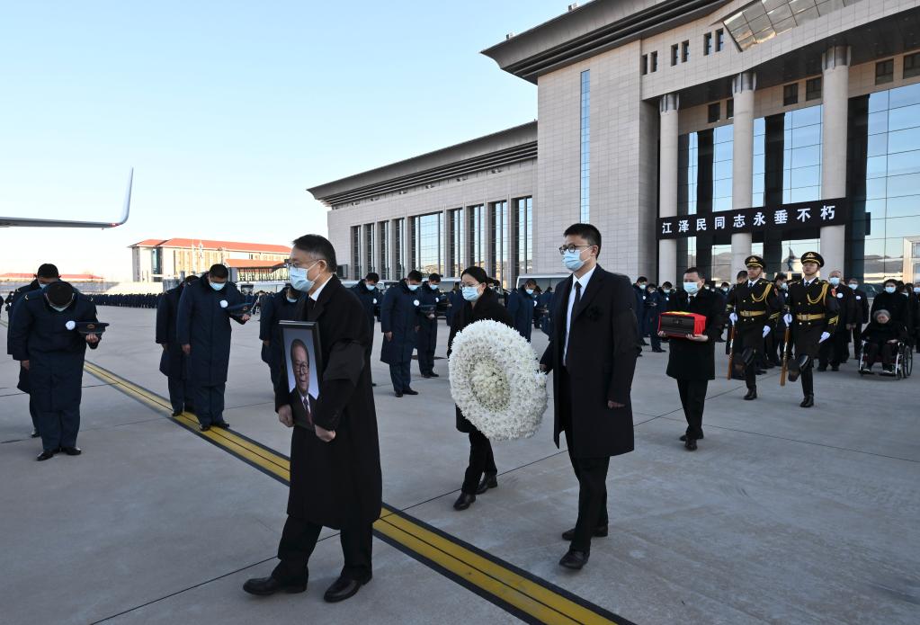 靈車緩緩駛?cè)胛鹘紮C(jī)場(chǎng)。松柏靜立,遠(yuǎn)山靜默??哲姽俦嘘?duì)脫帽,目送載護(hù)江澤民同志骨灰的專機(jī)起飛。專機(jī)盤旋著,在首都北京上空緩緩繞飛一周,告別這一江澤民同志為黨和國(guó)家事業(yè)傾盡心血的地方。