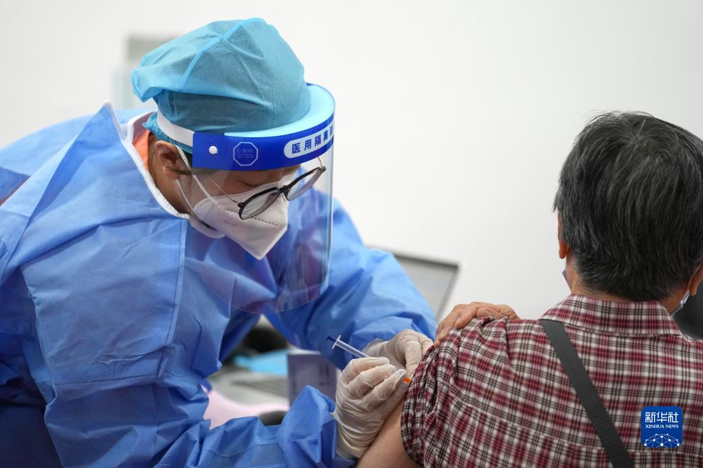 2022年7月13日,在北京市朝陽區(qū)奧運村街道一處新冠疫苗接種點,醫(yī)護人員為一名86歲的市民接種新冠疫苗加強針。新華社記者 鞠煥宗 攝