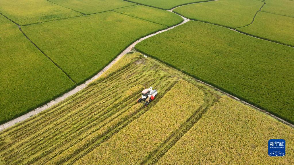 2022年9月28日,合肥市肥西縣花崗鎮(zhèn)河豐社區(qū)村民駕駛收割機收獲中稻(無人機照片)。新華社發(fā)(徐勇攝)