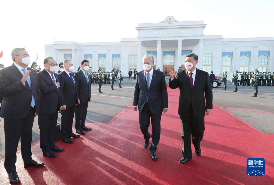 哈薩克斯坦總統(tǒng)托卡耶夫率政府副總理兼外長(zhǎng)特列烏別爾季、努爾蘇丹市市長(zhǎng)庫(kù)里吉諾夫等高級(jí)官員在機(jī)場(chǎng)熱情迎接。70余名禮兵分列兩側(cè)致敬,軍樂(lè)團(tuán)奏迎賓號(hào)角。兩名盛裝哈薩克斯坦女青年手捧鮮花,表達(dá)對(duì)習(xí)近平主席的熱烈歡迎。