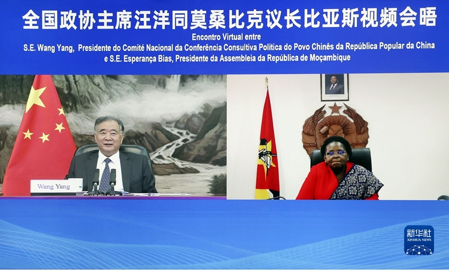 9月13日,全國政協(xié)主席汪洋在北京以視頻方式會見莫桑比克議長比亞斯。新華社記者 劉衛(wèi)兵 攝