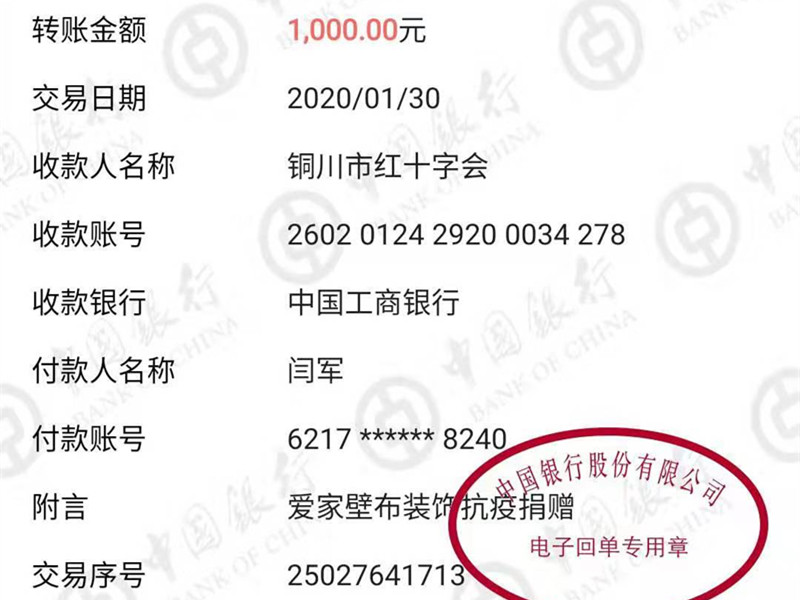 會員閆軍通過銀行轉(zhuǎn)賬為銅川市紅十字會捐贈1000元用于抗擊疫情。